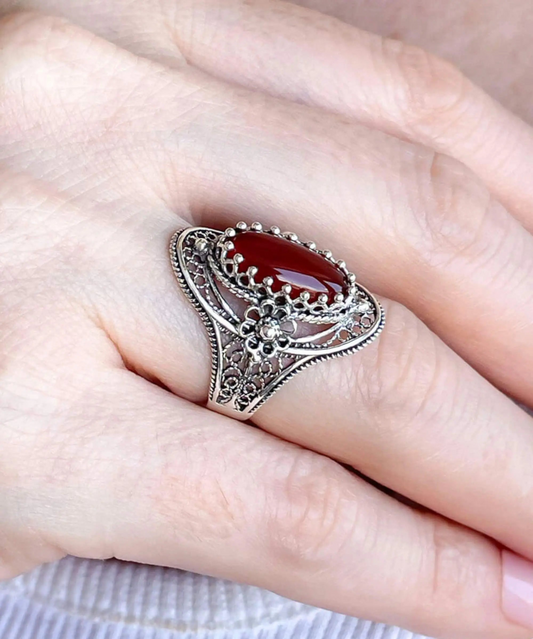 Carnelian Gemstone Sterling Silver Women Statement Ring with Daisy Figures